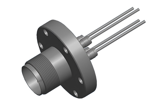 MS型功率饋通電極直徑為2.4mm,可選2/3/4/5/7/8針,最高電壓為700VDC,銅電極最大電流為23A/針,鎳電極最大電流為15A/針,溫度范圍-200~450℃,極限真空<1E-10mbar。